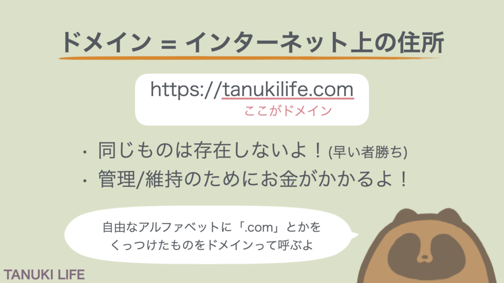 例えばこのブログ、「たぬきライフ」のドメインは「tanukilife」に「.com」を足した、「tanukilife.com」です。