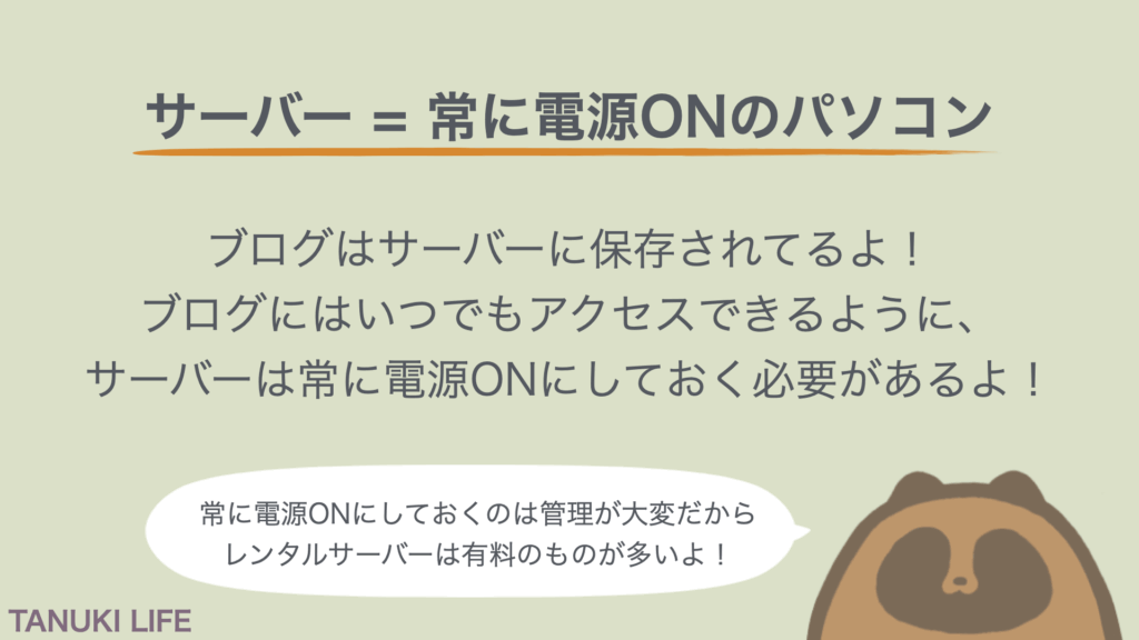 簡単に言うと、サーバーは常に電源ONのパソコンみたいなイメージです。